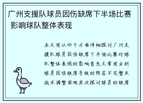 本文将从四个方面详细探讨广州支援队球员因伤缺席下半场比赛对球队整体表现的影响。首先,文章将分析球员因伤缺席导致的阵容不完整及战术调整困难;其次,探讨球员的缺席对球队士气和心理状态的负面影响;然后,分析缺席球员对球队进攻和防守体系的具体影响;最后,文章将讨论广州支援队其他球员如何应对这一挑战,是否能够...